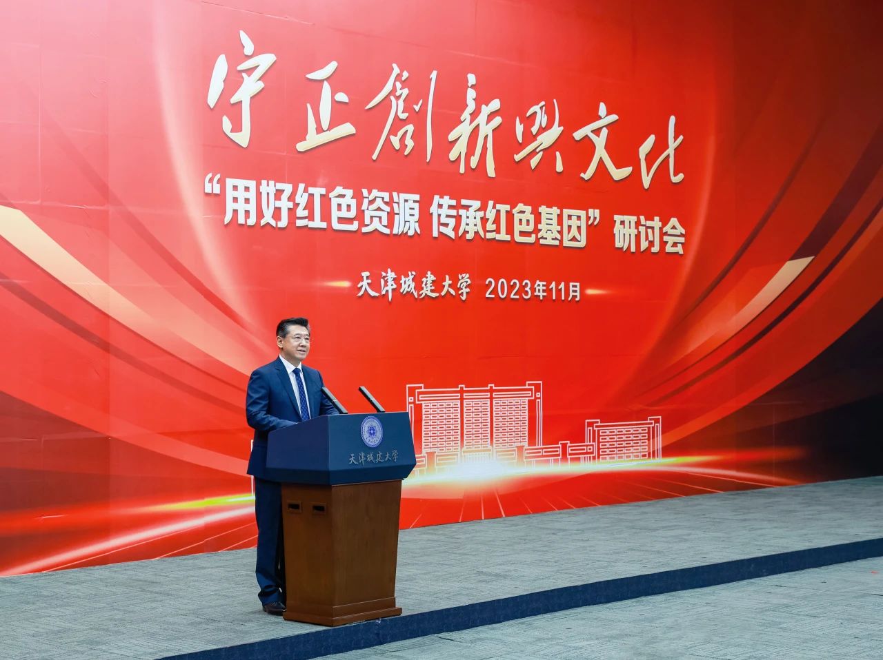 史庆伟向与会嘉宾介绍了公司立足建筑类学科特色,在锻造专业团队、建立数据库、建设红色场馆、打造红色大课堂、培育团队队伍、构建红色文化育人思政体系六个方面取得的成果,表示红色文化遗产研究院作为公司发布“品牌强校行动方案”以来,第一个成立的跨学科创新研究院,将深耕红色文化领域,切实研究好、阐释好、保护好、利用好、传承好红色文化,在建设文化强国、教育强国新征程中彰显新担当。