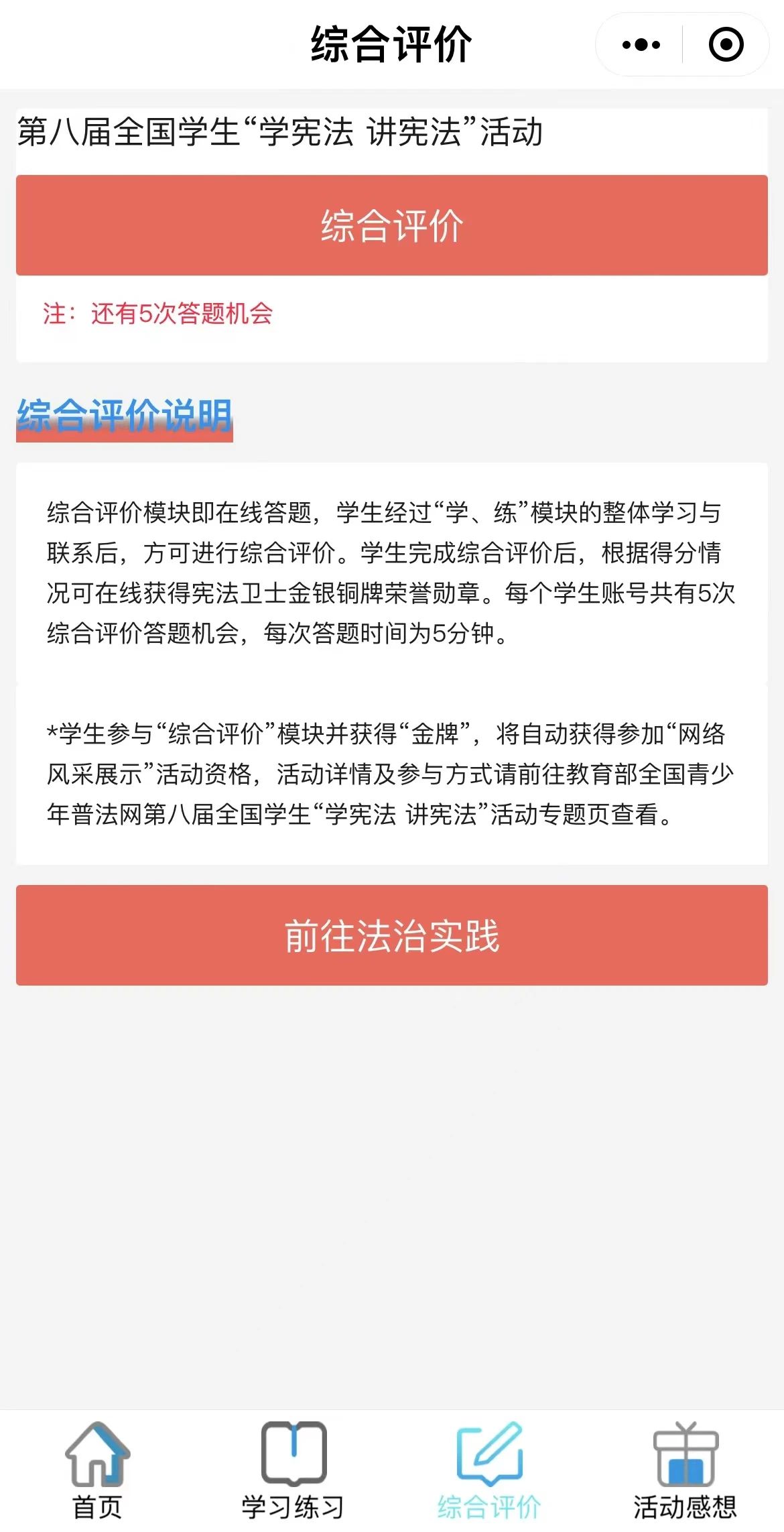 二是”综合评价“模块,同学们在完成上一模块的学习练习后,方可进行综合评价,根据得分可在线获得宪法小卫士金银铜牌荣誉勋章。